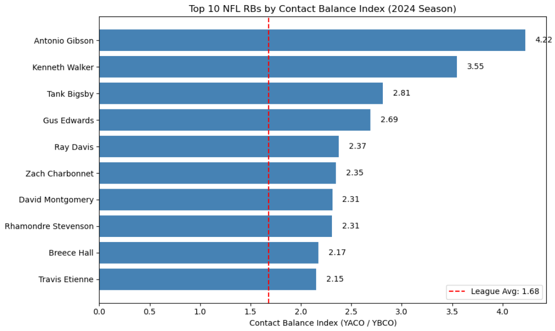 What is Contact Balance Index? The name Contact Balance Index is a boring AI derived label for a pretty cool stat that should be called something like Grit-Factor or The Get-The-Fuck-Off-Me Gene. It's a rushing stat that looks at the relationship between A rusher's yards before contact and yards after contact. A rusher's yards before contact are mostly reliant on the team around him, specifically the run blockers. Yards after contact, however, are all based on the rusher's power, vision balance and fuckin grit when being hit. A high CBI tells you when a rusher is doing more after contact than before it and helps us identify the rushers that, while they may not be popping off the stat page, they are running hard and their poor stats are more of a reflection of the team around them than their skill/effort.